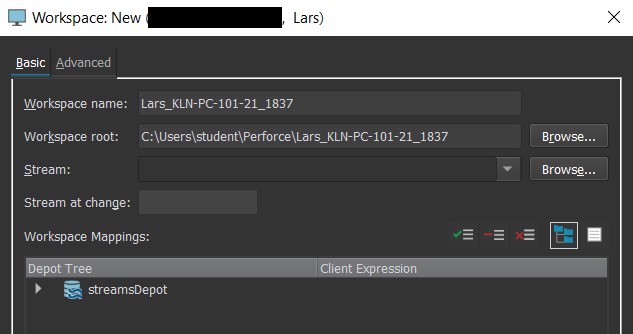 Workspace : At the first start, no workspace (a local copy of the Perforce depot) will exist. A new one can be created via “New…”.