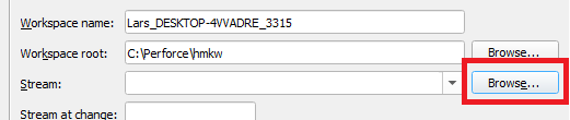 IMPORTANT: If a stream is not selected, Perforce will not complain but will create a workspace without complaint. Only when submitting files will you notice that something is wrong, as Perforce does not know where to submit the files without a stream.