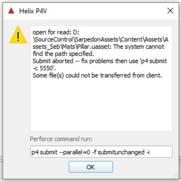 In rare cases, when downloading or uploading a file, a message may appear stating that the file in question could not be found. This occurs when a file has disappeared from the server itself (it will still appear in the history). This problem cannot be solved by the client, in these cases, a Perforce admin must be contacted.