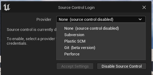 Unreal offers a Perforce connection by default. This can be accessed via the Source Control menu at the bottom right of the editor and the “Connect To Source Control…” item that appears:
