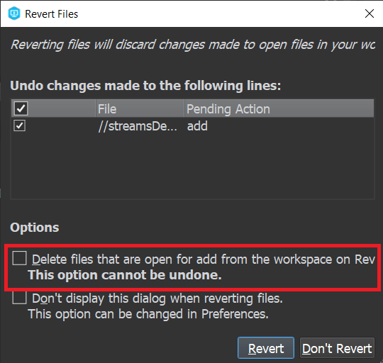 Similar to creating or editing files, files must also be deleted via Perforce or a program that is connected to Perforce (Unreal, Visual Studio) so that the deletion process can also be reported to the Perforce server.