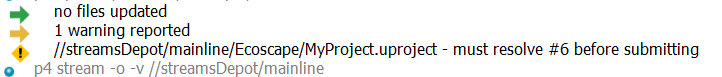 Perforce has noticed that there is a conflict and wants us to resolve it, or to use Perforce terminology, “resolve” it.