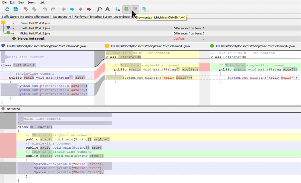 Here, the conflicting versions are juxtaposed and we have to choose how we want to resolve the conflict (red frame).