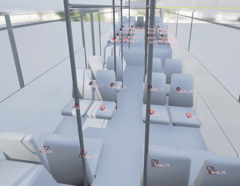 I have already manually created all the sockets for one column of seats, so all I need to do is add the same sockets for the remaining three. But Unreal doesn’t allow you to select or copy multiple sockets at once, so I’ll have to add the sockets for the remaining 21 one by one. And even this bus is a pretty tame example – I already worked with meshes that needed over 100 individually placed sockets.