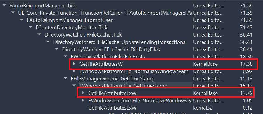The trouble starts after Unreal has found potentially outdated assets. Those are collected in a separate array called “DirtyFiles”. However, not all dirty files on this list are automatically considered for a reimport instead they are filtered again. Main criteria? The time since the last file modification needs to be higher than “Import Treshold Time”, an editor setting which is set to 3 seconds by default. This is probably a safety measure to prevent importing files that are still being written to from other processes. But even though this might be a good reason, this creates a big problem: We need to know the last modification time of every dirty file, and to know this, we have to ask the OS, which is often a very slow thing to do.