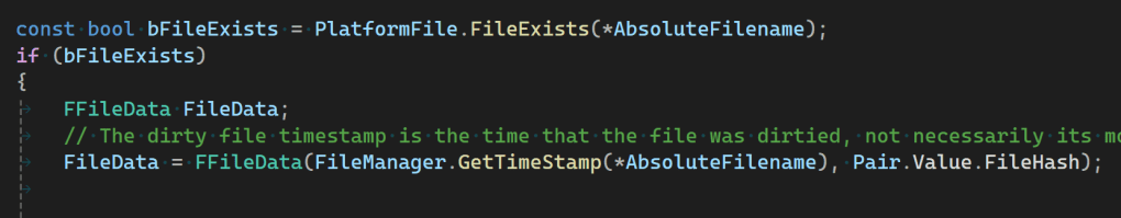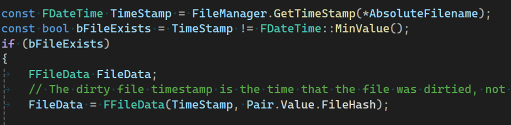 Why suspicious? Because it’s called via two different functions, FWindowsPlatform::FileExists and FWindowsPlatformFile::GetTimeStamp(), for the same file as you can see in the code example below. Note that the shown code isn’t exactly the original one but was simplified for clarity.
