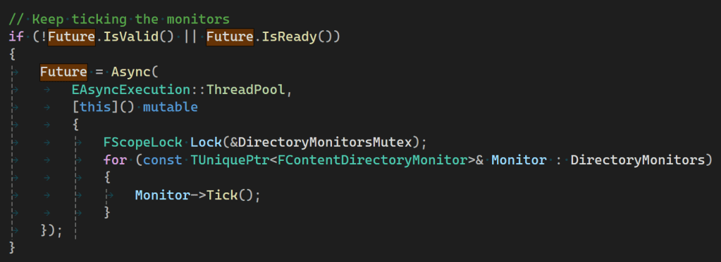 Luckily, the Unreal engine is quite smart about how to handle this giant task, and you can even see how it does this, by checking the involved classes FContentDirectoryMonitor and FFileCache in the engine source code. Most important to avoid any freezes of the editor is that all this scanning isn’t handled on the game thread, but on a separate thread via an async task. This way, even if the scanning of assets takes a while, the user won’t really notice, except that the notification about will be a few frames late.