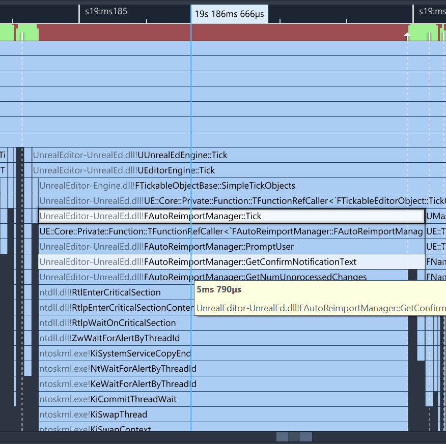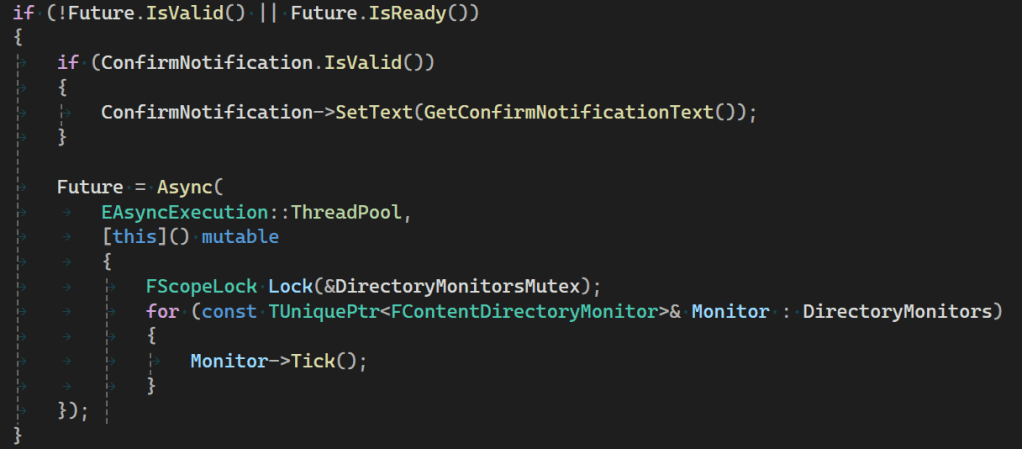 In this example you can also see the newly created mutex, which blocks other functions from interacting with the DirectoryMonitors array while the async task is running. Sprinkling mutexes doesn’t feel that elegant, and after a first test run, the profiler instantly shows the several drawbacks. The 26ms of file diffing are indeed not done on the game thread anymore, but one of the mutexes blocks the game thread, since right after launching the async task the GetConfirmNotificiationText() function accesses the mutex.